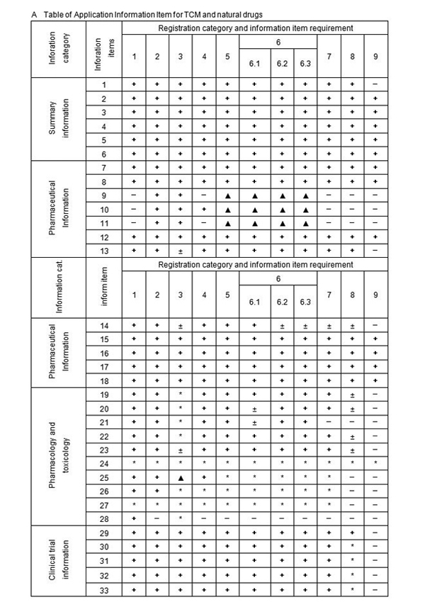 1) Information item 1-30 (except for item 6) of Table of Application Information Item should be submitted for Application of Drugs under Registration Categories 1-5. Re-compiled summary Information Items 1-6, Information Item 12 and 14, clinical Information Items 28-32 and other changes and supplemental information shall be submitted and numbered with the numbers of Information Items upon the completion of the clinical study. For the drugs under Registration Category 1, upon the completion of the clinical study, all the required information of Information Items 1-30 should be re-edited according to the result of trails conducted during clinical study, and then be re-submitted. When the registration of drug substance and registration of preparation of the chemical drug under Registration Category 3 and 4 are applied at the same time, the registration of drug substance should comply with the requirement for production.